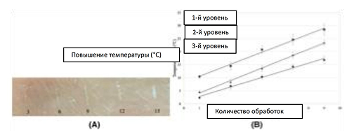 РИСУНОК 5. A) ЗТВ в образце куриной грудки ex vivo в зависимости от количества ЛО (3, 6, 9, 12 и 15) при применении терапевтических картриджей (ТК) с глубиной фокусировки 4,5 мм и первым уровнем энергии; B) повышение температуры как функция от количества ЗТВ при трех разных уровнях энергии.