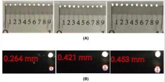 Используя ТК с глубиной фокусировки 4,5 мм, авторы репрезентативным образом воздействовали на прозрачную акриловую пластину толщиной 4 мм и получили 10 независимых ЗТВ при трех разных уровнях энергии. Прозрачную линейку разместили поверх ЗТВ и сфотографировали камерой смартфона для определения длины ЛО и расстояния между ЗТВ. Для получения четкого изображения ЗТВ при воздействии трех разных уровней энергии использовали увеличитель экрана смартфона (MAGNI) с 8-кратным увеличением. Размеры ЗТВ определяли с помощью программного обеспечения MAGNI.
