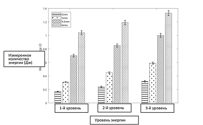 Контрольную и исследуемую температуры образца измеряли одновременно каждую секунду при помощи двух термоэлектрических датчиков, расположенных на глубине 4,5 мм и на расстоянии 2,2 см друг от друга. Повышение температуры рассчитывали как разницу между исследуемой и контрольной температурой. Измерения проводили пять раз. Полученные значения усредняли для каждого уровня энергии.