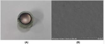 РИСУНОК 2. А) Преобразователь микрофокусированного ультразвука (MFU) с гладкой и ровной поверхностью; B) изображение поверхности преобразователя MFU, полученное методом сканирующей электронной микроскопии при увеличении в 1000 раз.