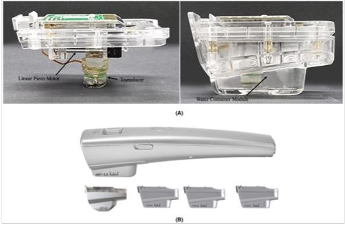 На рисунке 1А показан одноразовый модуль ТК, включающий электронную плату для управления преобразователем MFU, установленным на ЛПД, и модуль контейнера с водой. На рисунке 1B представлен аппарат ULTIGHT, состоящий из основного блока управления и четырех сменных ТК, работающих на частоте 7 МГц и обеспечивающих глубину фокусировки 2, 3, 4,5 и 6 мм.